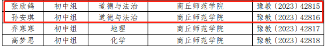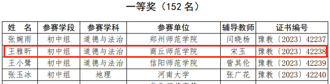 日前,河南省教育厅下发《关于公布第二十届高等学校师范类专业毕业生教学技能比赛结果的通知》(教师〔2023〕209号),人人操人人摸人人干思想政治教育专业2023届毕业生王雅昕获得初中组道德与法治学科一等奖,张欣鸽、孙安琪获得初中道德与法治学科三等奖,宋玉老师获得优秀辅导教师奖。