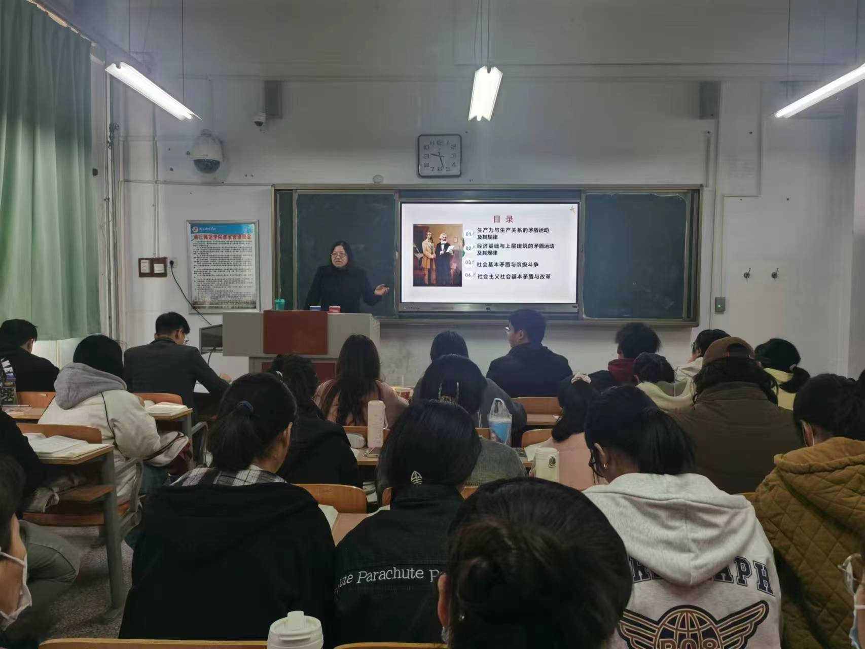 李凌云老师结合党的二十大报告、经济发展形势预测和中国共产党为什么能的相关资料导入“社会基本矛盾运动及其规律”这一主题,以分组讨论的形式讲授了“生产力和生产关系的矛盾运动及其规律”“经济基础和上层建筑的矛盾运动及其规律”“社会基本矛盾与阶级斗争”“社会主义社会基本矛盾与改革”等内容。