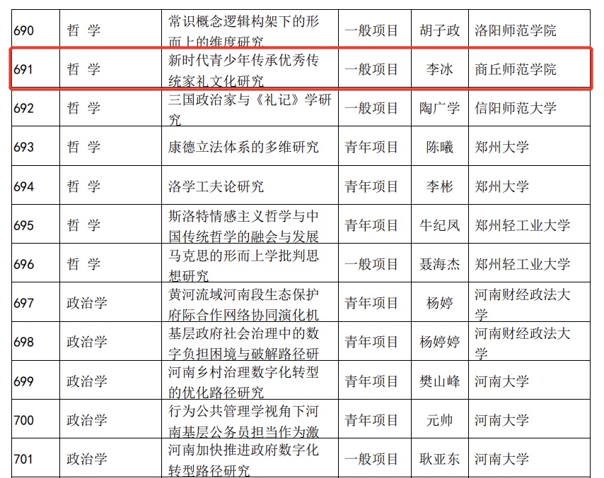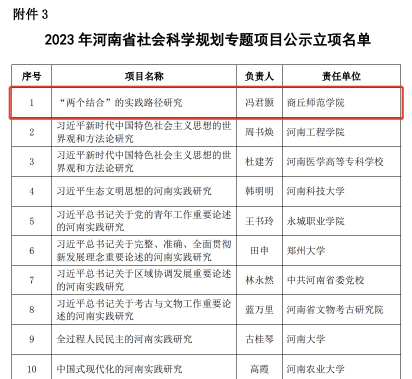 近日,河南省哲学社会科学规划办公布了2023年河南省哲学社会科学规划年度项目、决策咨询项目、专题项目立项名单,我院两位教师获批立项,分别是冯君颢博士的《“两个结合”的实践路径研究》和李冰博士的《新时代青少年传承优秀传统家礼文化研究》。