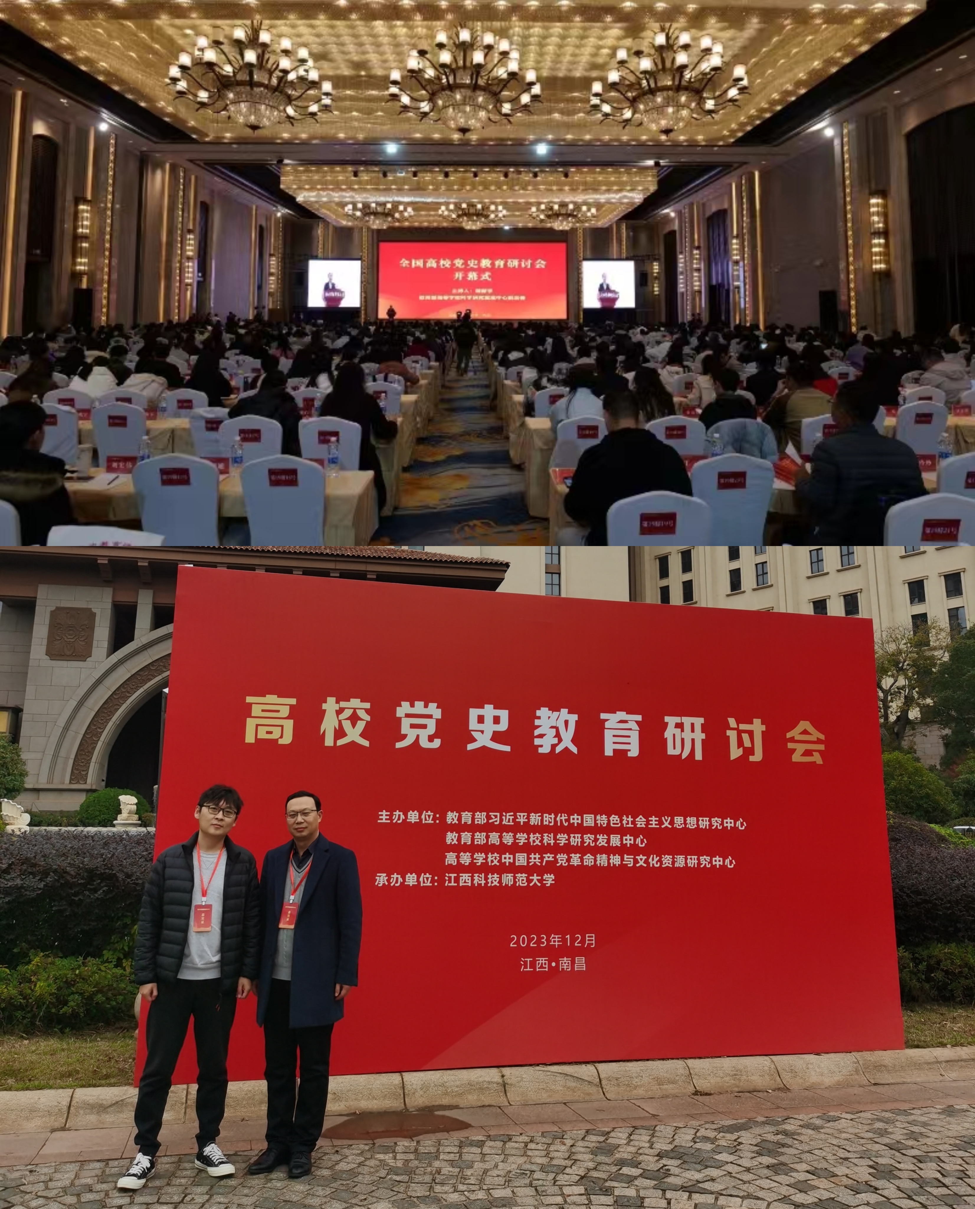 为深入学习贯彻党的二十大精神,弘扬伟大建党精神,传承中国共产党人精神谱系,推动中共党史、伟大建党精神与文化资源研究教育宣传,充分发挥中共党史资政育人作用,12月2日至4日,由教育部习近平新时代中国特色社会主义思想研究中心、教育部高等学校科学研究发展中心、高等学校中国共产党革命精神与文化资源研究中心主办,江西科技师范大学承办的以“伟大建党精神与中国式现代化”为主题的高校党史教育研讨会在江西省南昌市召开。来自中共中央党校(国家行政学院)、北京大学、中国人民大学、北京师范大学、复旦大学、武汉大学等300余所高校、党校、科研院所,以及《光明日报》《中国教育报》《中国高校社会科学》《史学月刊》《江西社会科学》《求实》等相关期刊媒体700余名专家学者和师生参加会议。我院教师张灯和孙国栋两位博士应邀参加会议。
