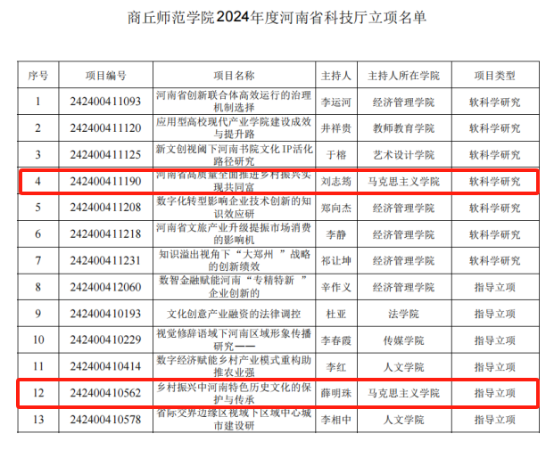 近日,河南省科技厅公布了2024年度河南省科技厅软科学立项项目清单,我院两位教师获批立项,分别是刘志筠博士的《河南省高质量全面推进乡村振兴实现共同富裕的路径研究》和薛明珠博士的《乡村振兴中河南特色历史文化的保护与传承》。