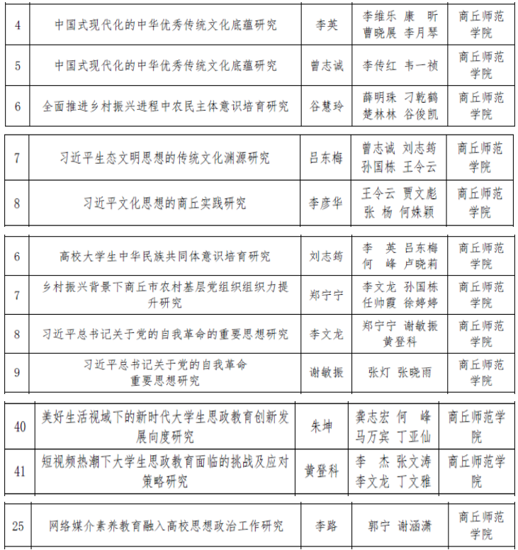 近日,商丘市哲学社会科学规划办公室发布《关于下达2024年度商丘市哲学社会科学规划立项课的通知》,我院教师获批12项。其中马列科社类项目5项,主持人分别为李英、曾志诚、谷慧玲、吕冬梅、李彦华;党史党建类项目4项,主持人分别为刘志筠、郑宁宁、李文龙、谢敏振;教育学类项目2项,主持人分别为朱坤、黄登科;其他类项目1项,主持人为李路。