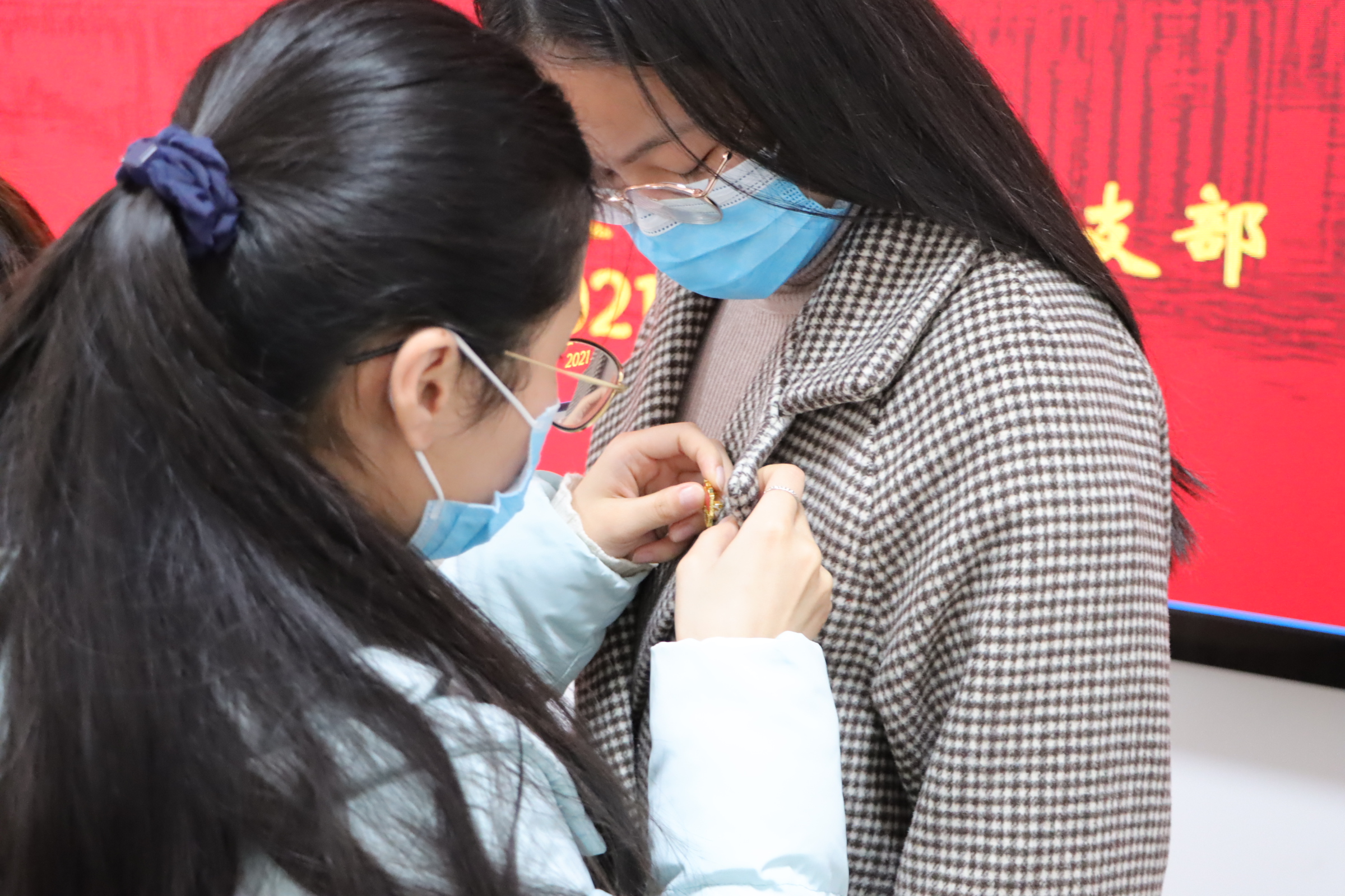 会上,南月、王媛等十名拟发展对象向支部全体党员同志就入党动机以及思想认识作了详细的汇报,入党介绍人向全体党员同志介绍了拟发展对象的基本情况,黄登科代表支部委员会报告全体发展对象同志的审查情况。随后,全体正式党员经过无记名投票表决同意接收南月、王媛等十名同志为中国共产党预备党员,并由正式党员为新党员佩戴党员徽章,发放理论学习记录本。最后,黄登科强调,全体同志要自觉主动加强理论学习,要将理论知识内化于心、外化于行,自觉遵守组织纪律,积极完成党组织交给的任务。