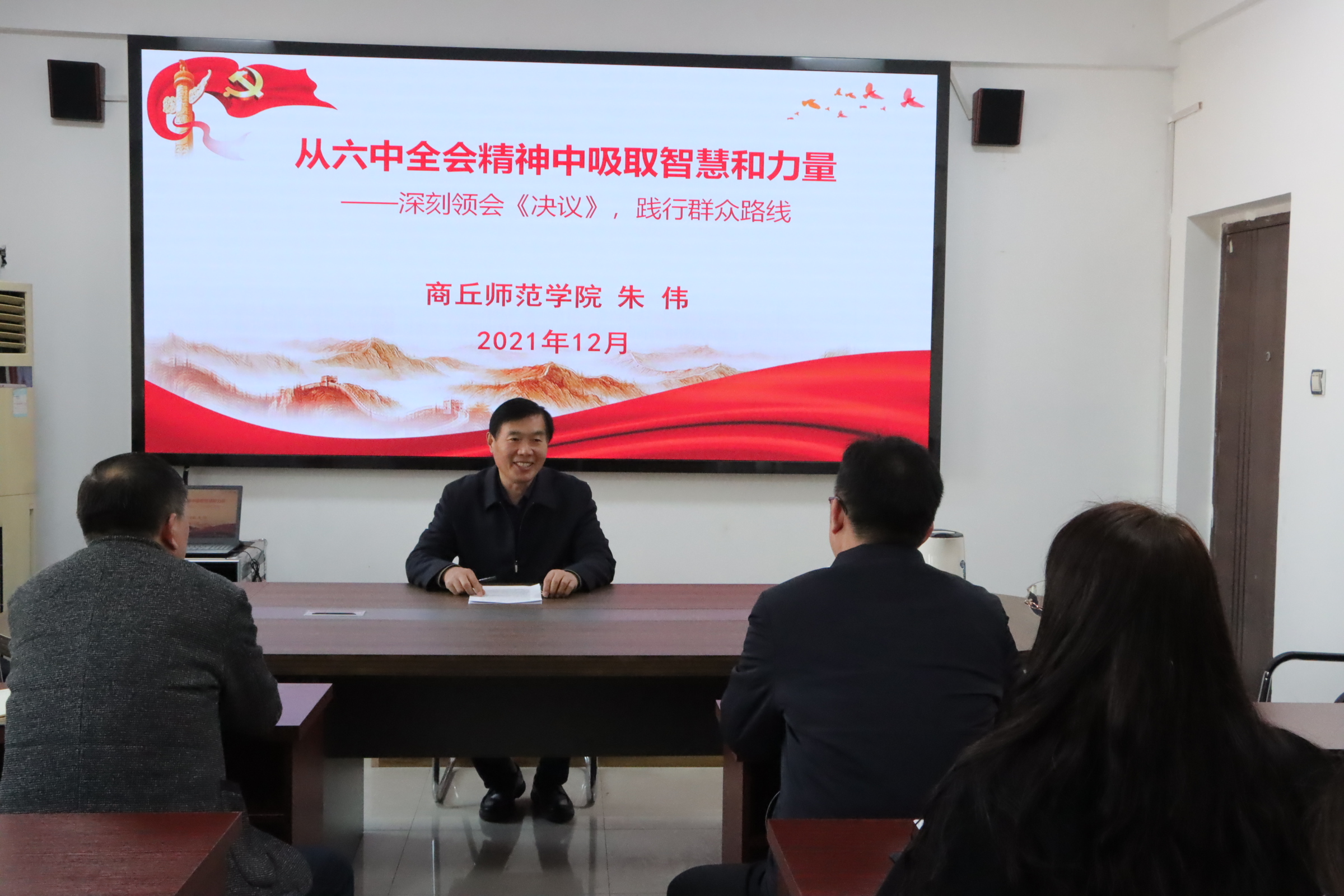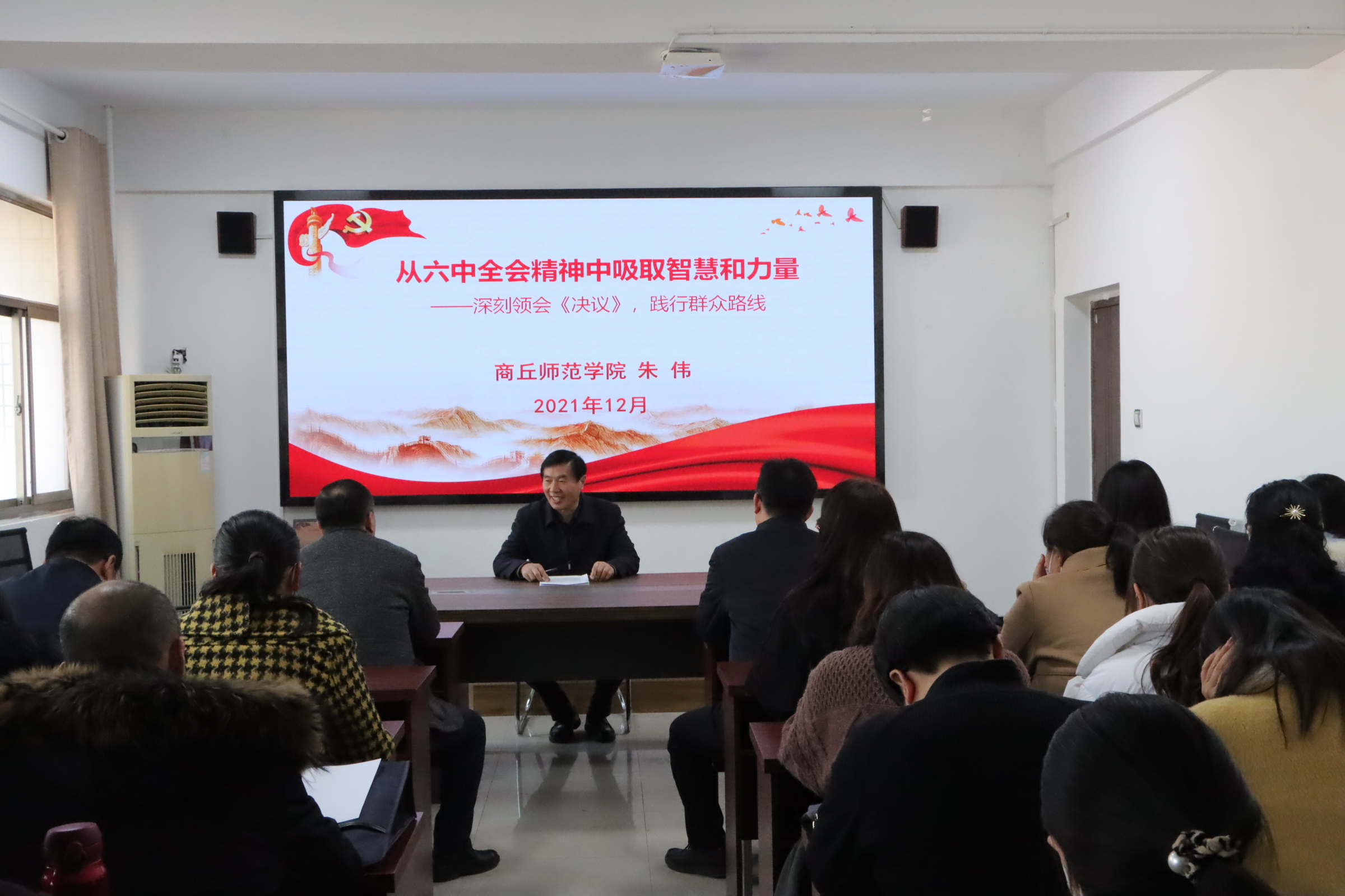 为深入学习贯彻党的十九届六中全会精神,持续推动十九届六中全会精神融入思政课教学,12月22日,校党委副书记、工会主席朱伟在梁园校区应天楼817会议室为人人操人人摸人人干全体教职工讲授党的十九届六中全会精神专题党课。