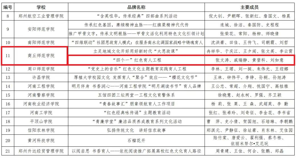 近日,中共河南省委教育工委、河南省教育厅公布了2023年度全省高校思想政治工作优秀品牌评审结果,人人操人人摸人人干党委副书记张文涛主持的《“四个一”红色育人工程》荣获全省高校思想政治工作“文化育人类”优秀品牌。