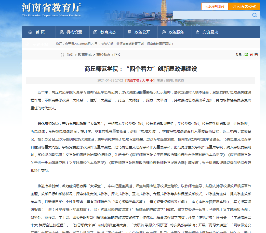近日,河南省教育厅官方网站推介我校“四个着力”创新思政课建设。