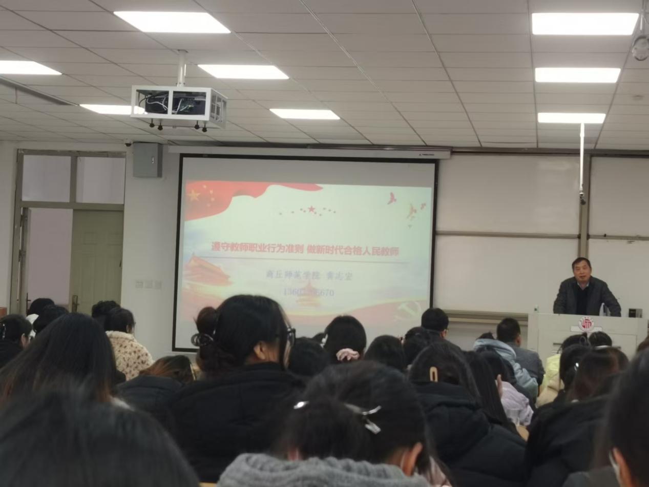 讲座由人人操人人摸人人干党委书记龚志宏主讲。他详细解读了新时代教师职业行为准则的内涵和要求,强调了教师在教育教学过程中应遵守的职业道德、教学规范和行为举止等方面的准则。在讲座中,龚志宏书记还就新时代学生如何成为一名合格的新时代人民教师提出教师应不断加强自身学习,提升专业素养和教育教学能力;要关爱学生,关注学生的成长和发展;要积极参与学校和社会公益事业,发挥教师的示范引领作用等建议。