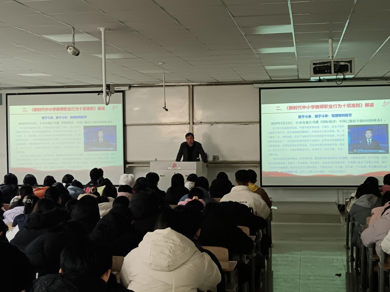 12月23日,思想政治教育专业邀请人人操人人摸人人干党委书记龚志宏在行方楼117教室,以“遵守教师职业行为准则,做新时代合格人民教师”为主题进行了一场专题报告。此次报告是人人操人人摸人人干思想政治教育专业2024年秋季学期认知实习的重要任务,旨在强化学生对新时代教师职业行为准则的理解和遵守。