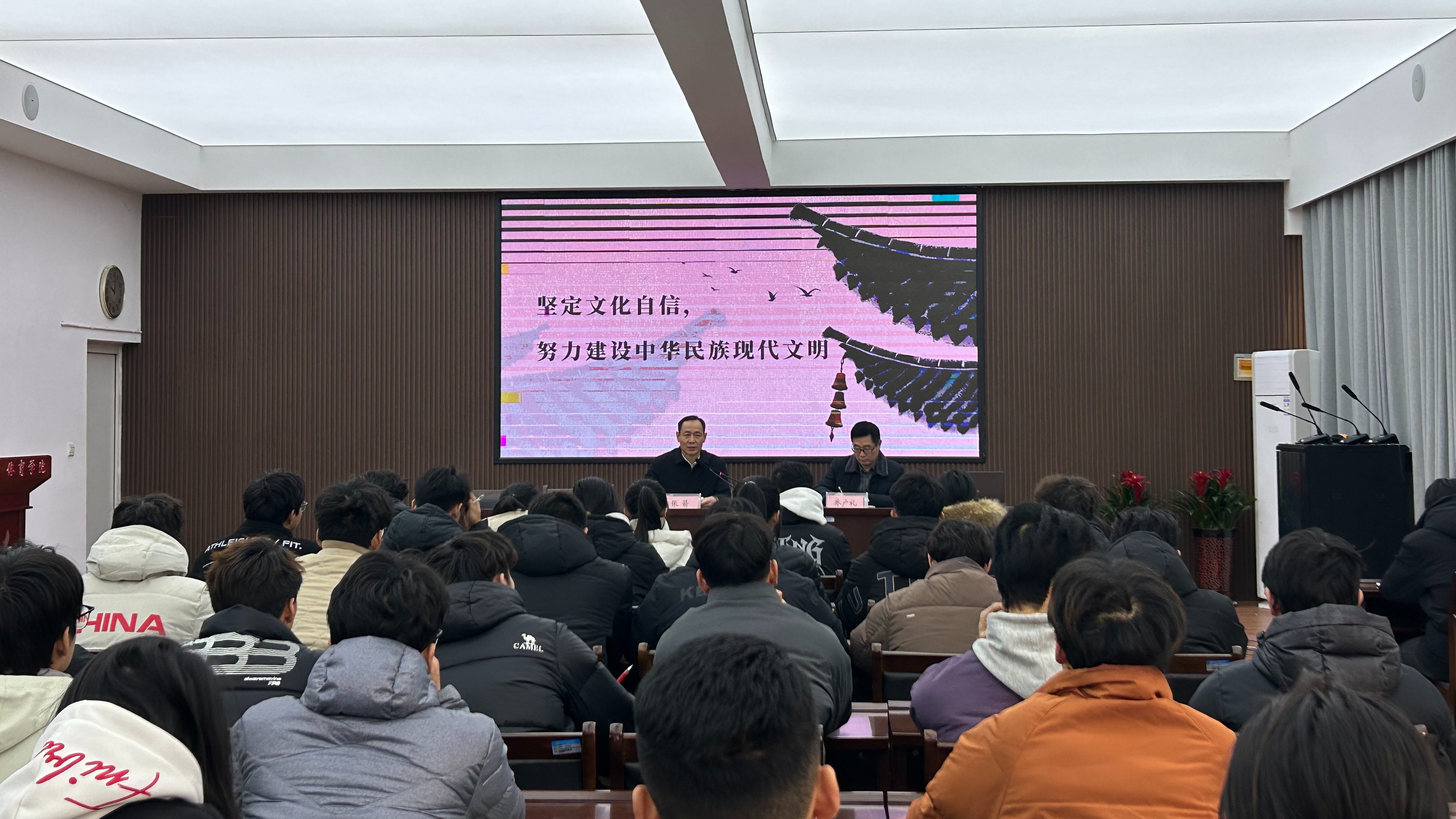 12月31日,副校长张箭以《坚定文化自信 努力建设中华民族现代文明》为题为体育学院学生讲授思政课。张箭主要从历史、现实与未来的三个维度,深入剖析了文化自信对于中华民族发展的重要性。他指出,中华文明源远流长,博大精深,是中华民族独特的精神标识。在新的历史时期,我们要深入挖掘和阐发中华优秀传统文化的时代价值,推动其创造性转化和创新性发展,使之成为涵养社会主义核心价值观的重要源泉。他勉励青年学子要深刻认识到坚定文化自信的重要性,将把所学所得运用到实际工作中去,为推动社会主义文化繁荣兴盛贡献自己的力量。
