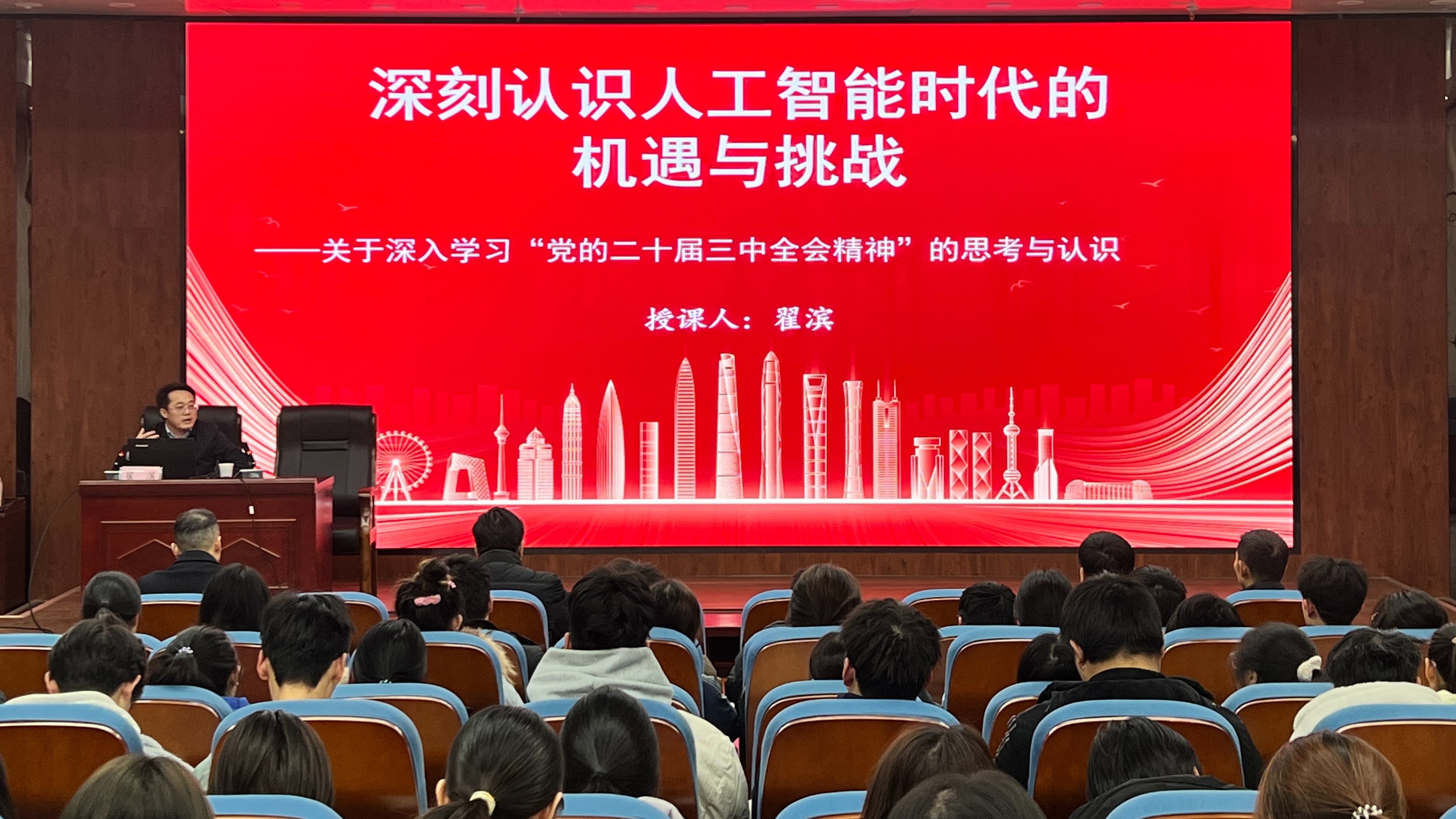 12月31日,副校长翟滨以《深刻认识人工智能时代的机遇与挑战——关于深入学习“党的二十届三中全会精神”的思考与认识》为题为电子电气工程学院师生讲授专题思政课。翟滨结合党的二十届三中全会关于人工智能相关内容,从“人工智能的概念及发展过程”“全球人工智能领域发展的基本情况”“深刻认识人工智能时代的机遇与挑战”“新时代大学生如何识变应变”四个方面展开授课,详细阐述了人工智能赋能各行各业带来的机遇与挑战,以及新一轮科技革命和产业变革的重要影响。他勉励青年学子要树牢终身学习理念,重视团队协作,树立问题意识,培养创新精神。