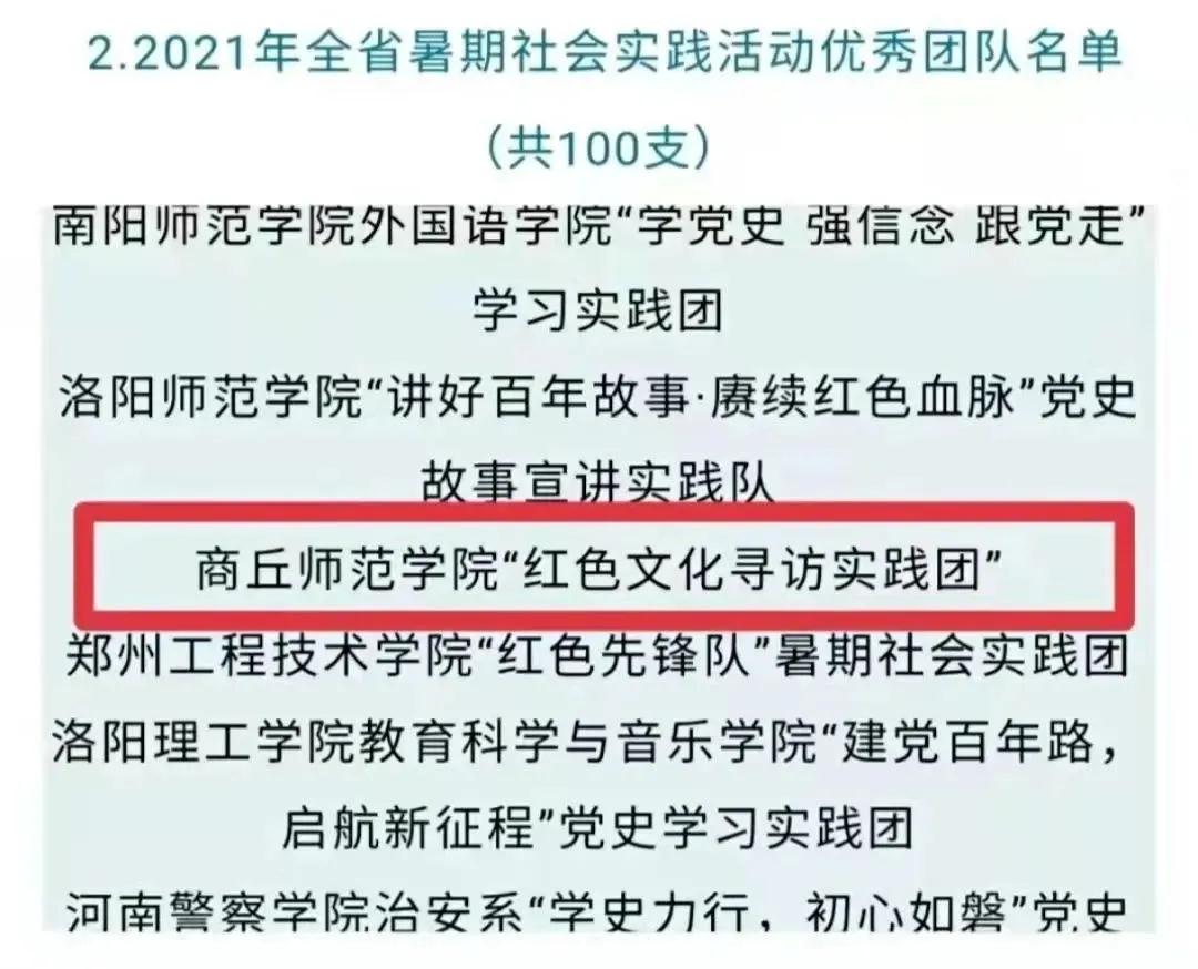 近日,团省委对全省2021年暑期社会实践活动进行了总结,表彰了积极组织、指导和参与社会实践活动并取得优秀成果的团组织、实践单位、实践团队、品牌项目及个人。由人人操人人摸人人干2020级学生组建的商丘师范学院“红色文化寻访实践团”获评省级优秀团队。