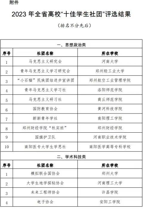 近日,由河南省委教育工委、河南省教育厅举办的全省高校“十佳学生社团”评选结果揭晓,我院“马克思主义研习社”经过层层选拔荣获思想政治类“十佳学生社团”。